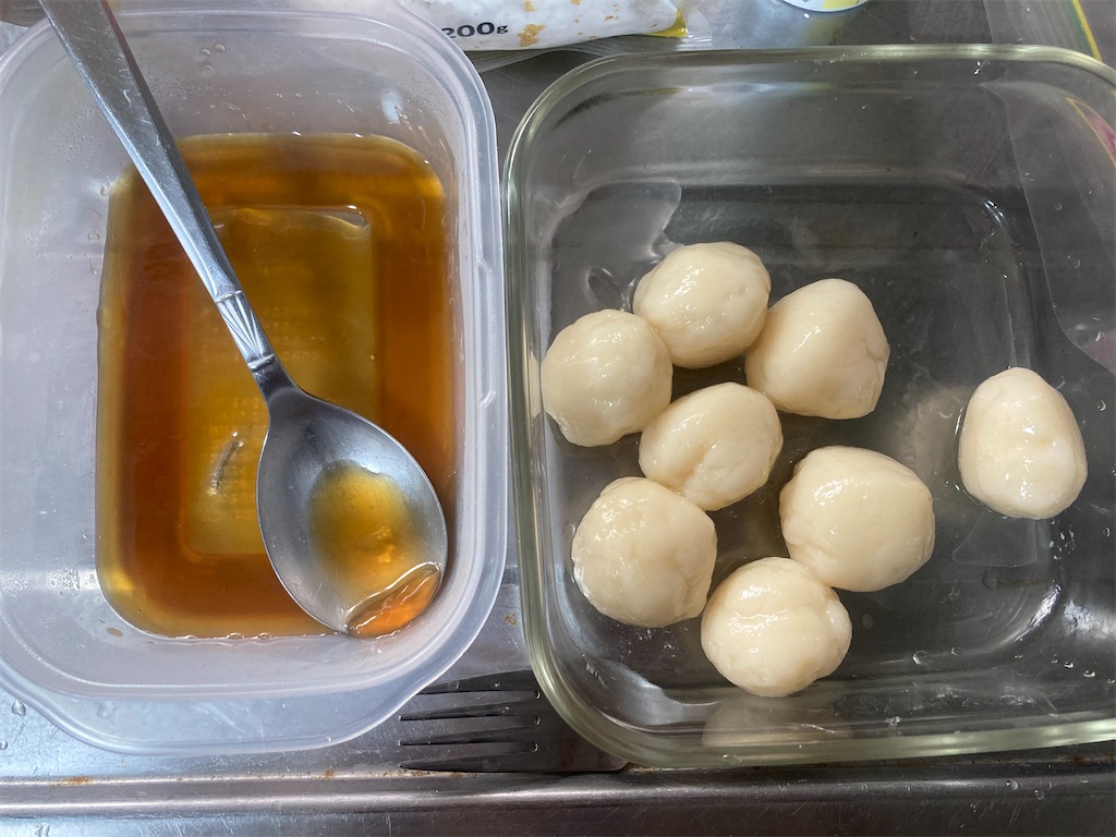 ちなみにタレはレンジで醤油とラカントを溶かし、水溶き片栗粉を加えてまた加熱。